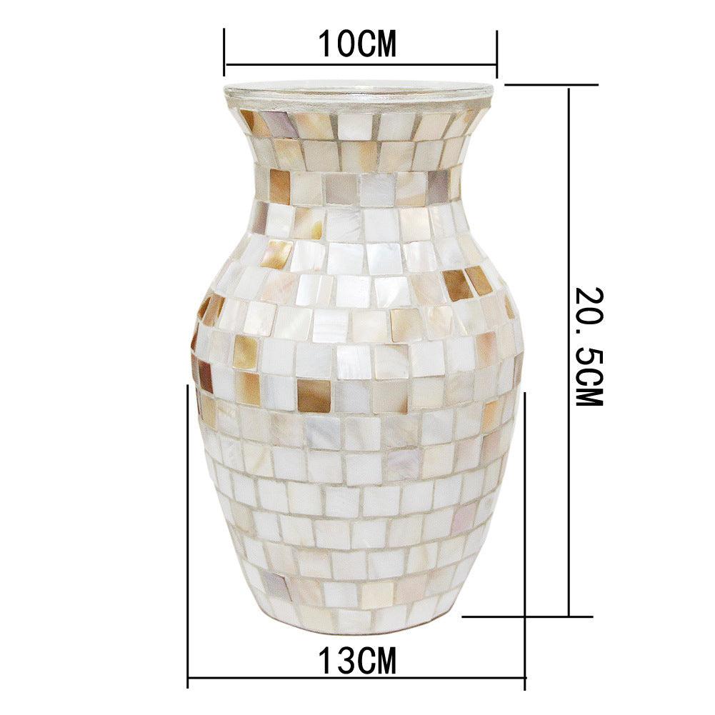 Embrace the essence of European elegance with our Artisanal White Shell Mosaic Glass Vase. This exquisite piece is a celebration of artisanal craftsmanship and timeless beauty, expertly handcrafted to create a stunning focal point for any space.